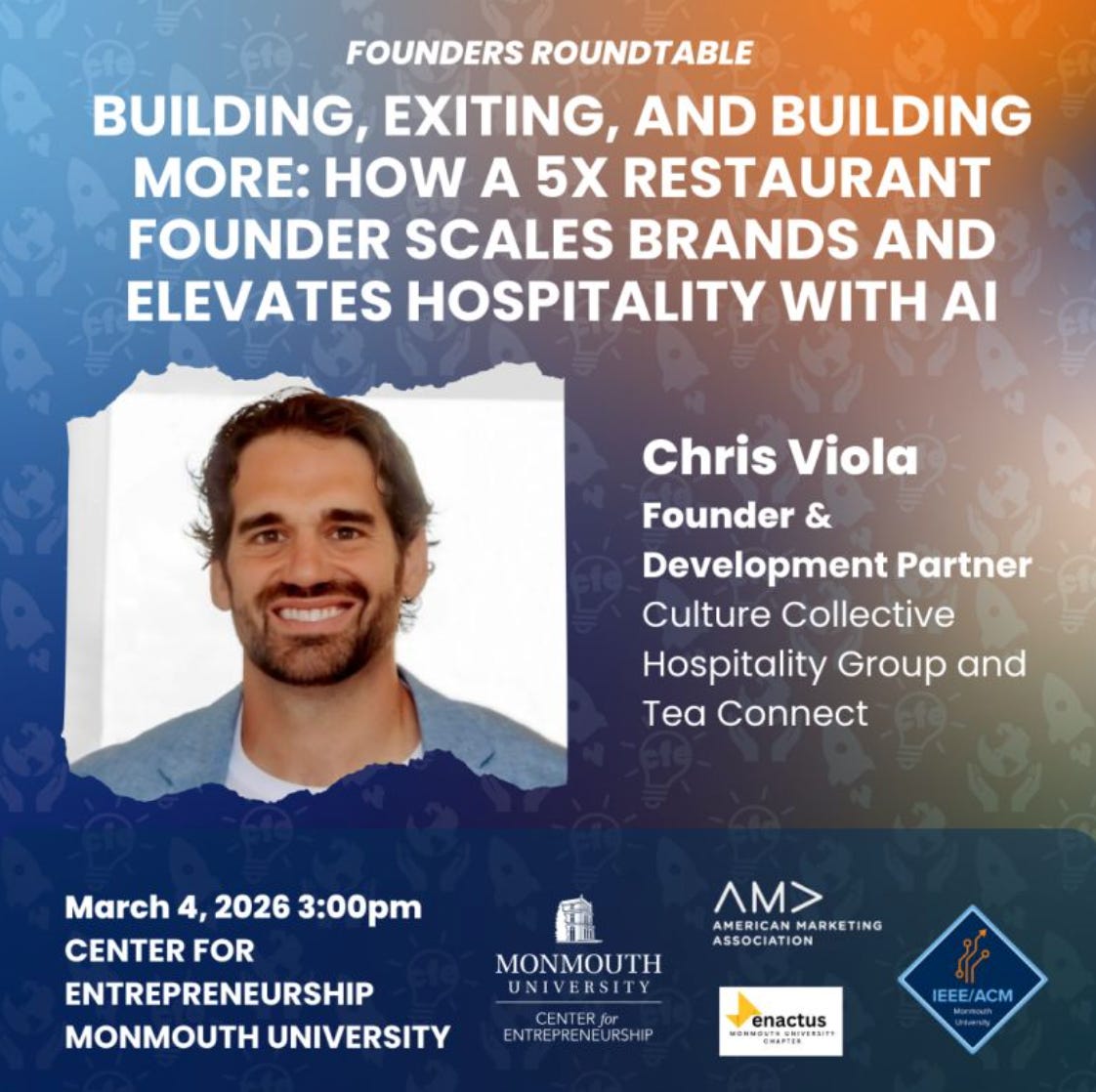Founders Roundtable: the Center for Entrepreneurship at Monmouth University (our supportive host and partner) next event “Building, Exiting, and Building More: How a 5x Restaurant Founder Scales Brands and Elevates Hospitality with AI”